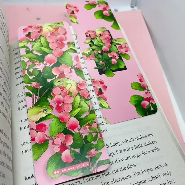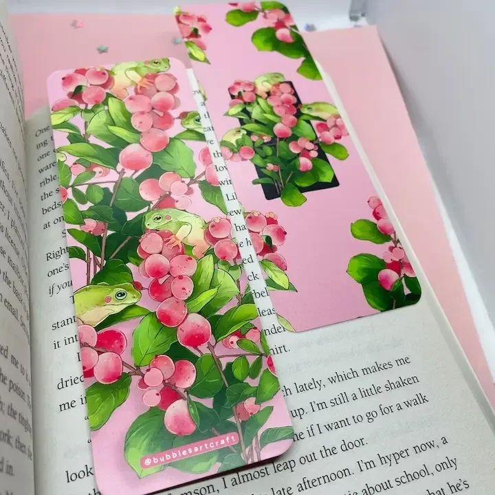 Ce marque-page aux coins arrondis est souple mais robuste, recto-verso avec deux impressions différentes. La face arrière présente un motif répété du motif de grenouilles et snowberries.