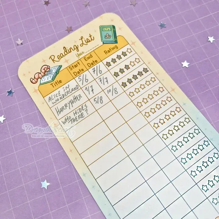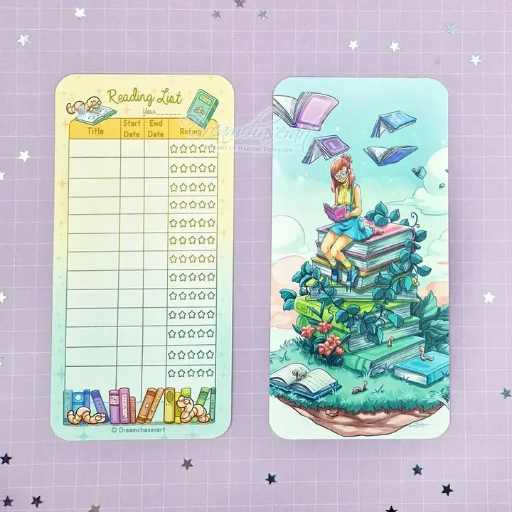 Recto avec une illustration et verso avec une liste de lecture où vous pouvez noter les livres que vous avez lus et ce que vous en avez pensé !