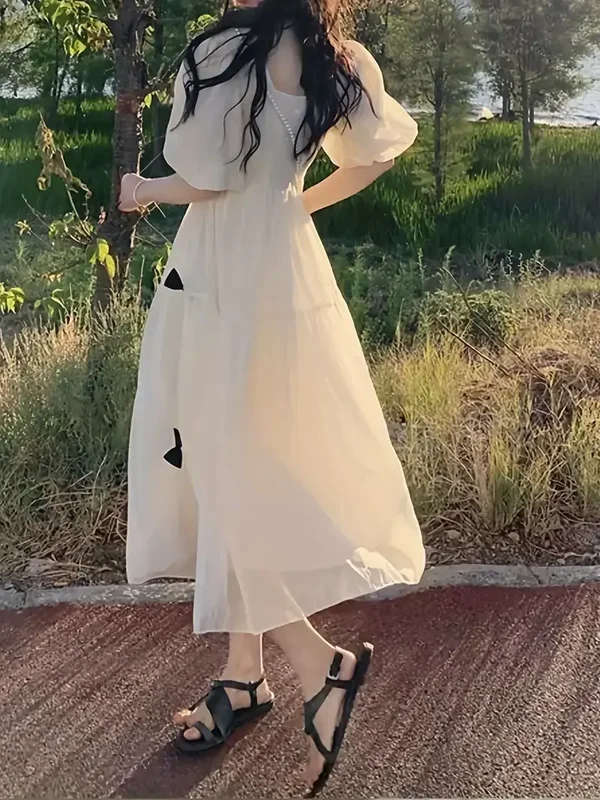Très jolie robe couleur crême avec de petits noeuds papillons pour une touche de douceur.